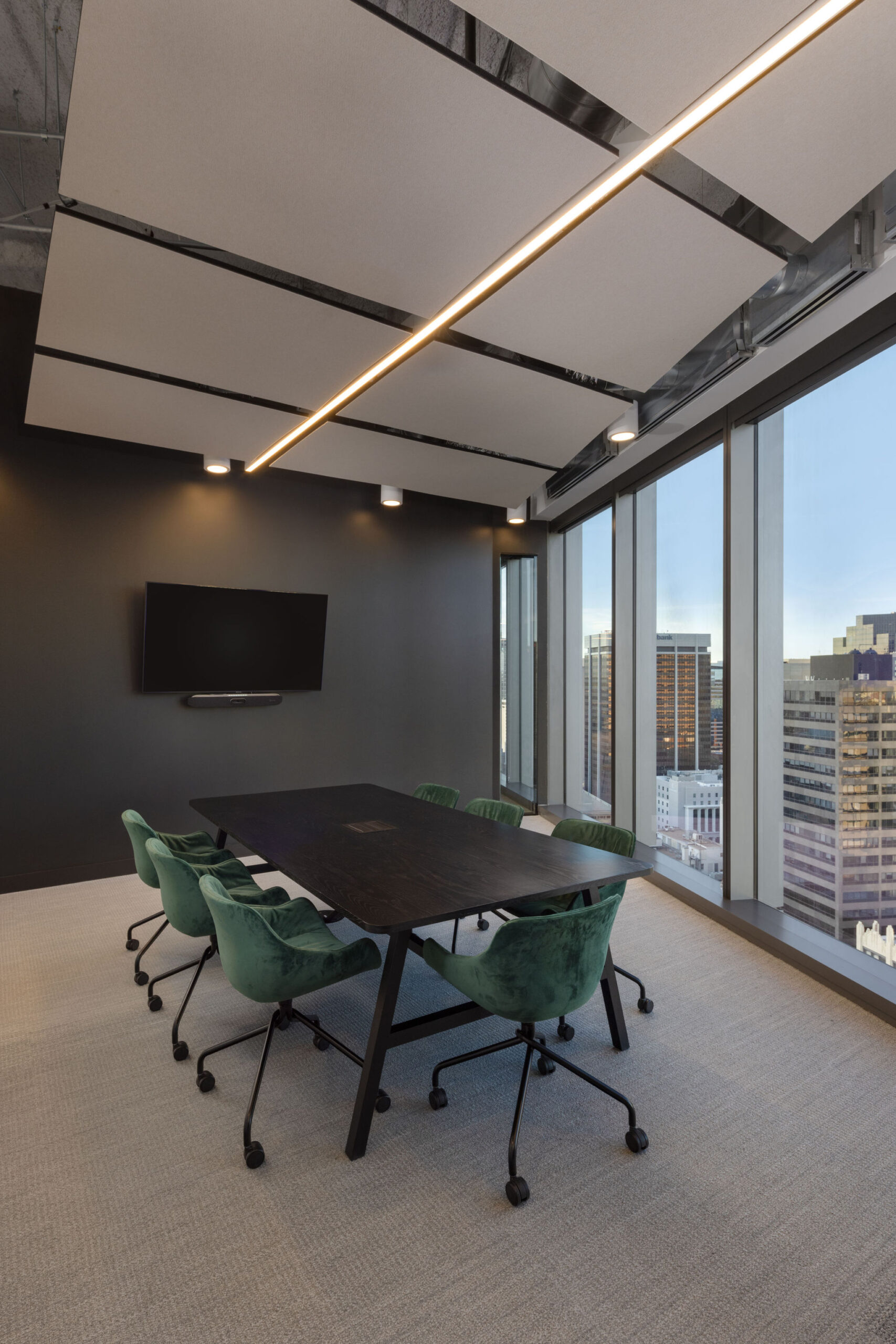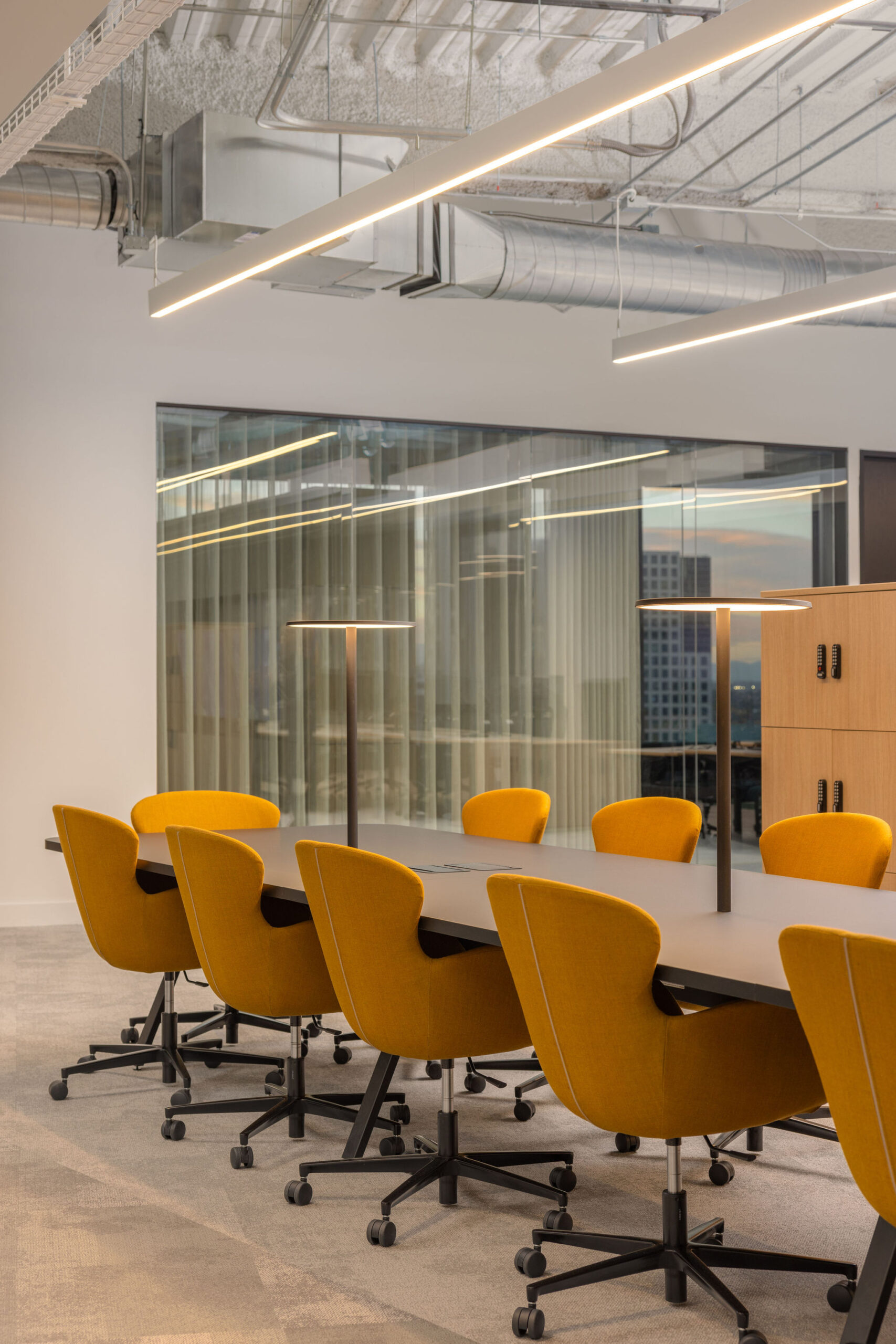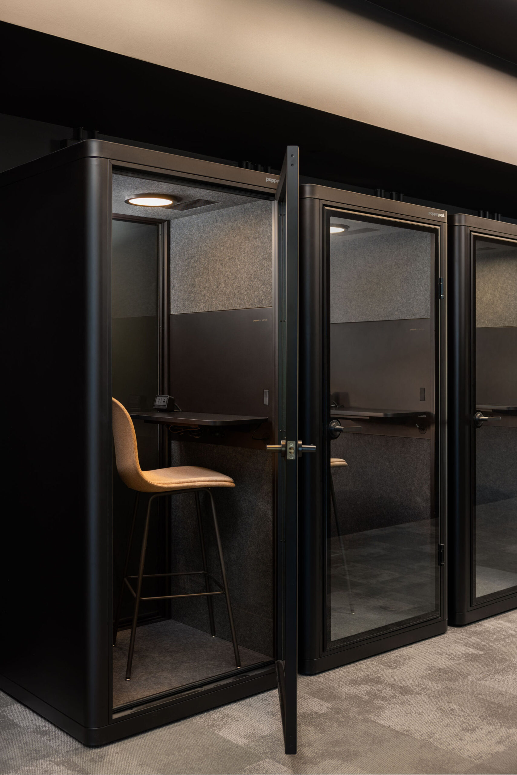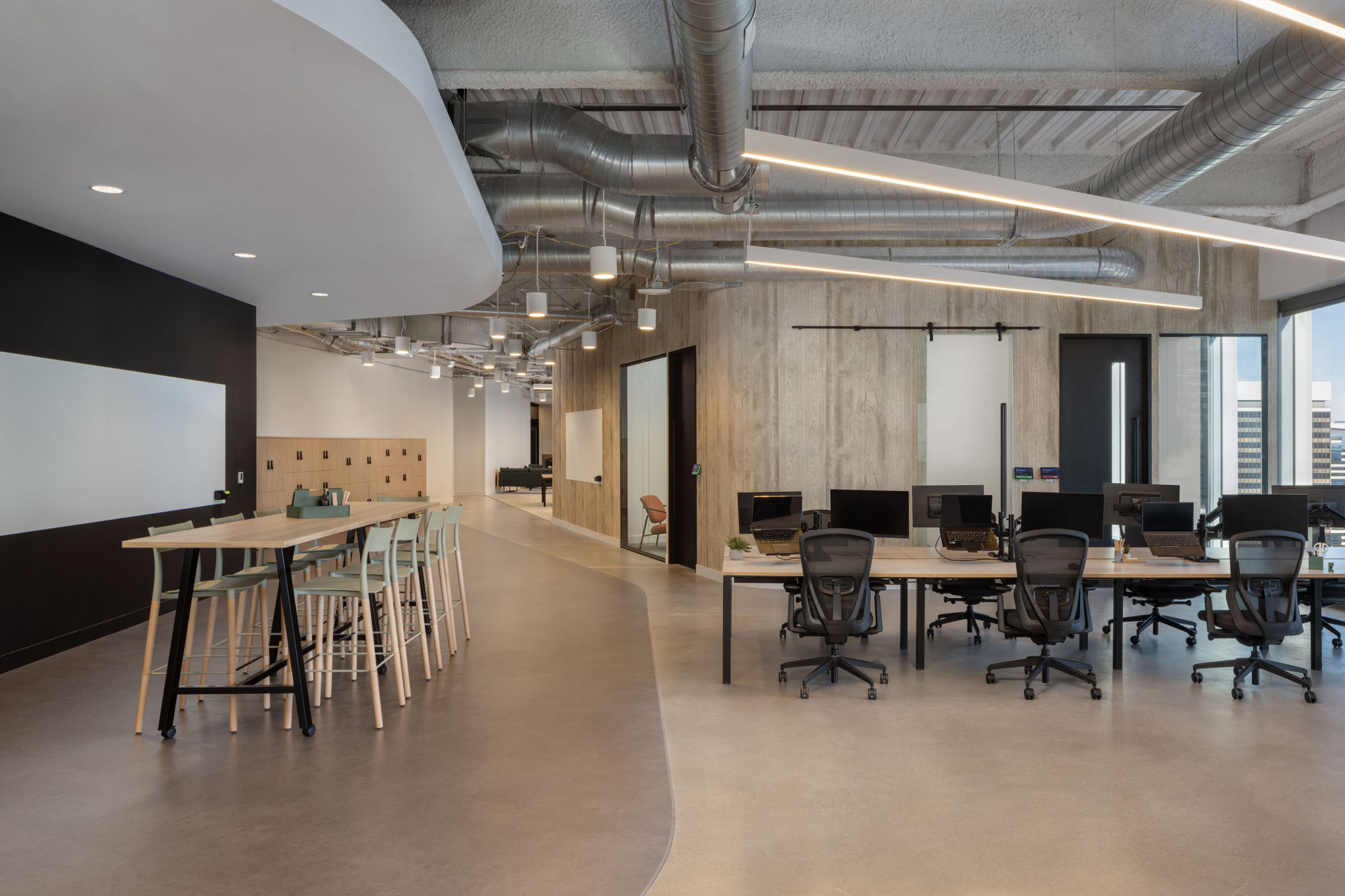 A mix of height adjustable and fixed height workstations in the open office, locker storage for hoteling team members, multiple lounge and collaboration spaces, rows of phone booths for private spaces and an elaborate board room space for global team members to meet.